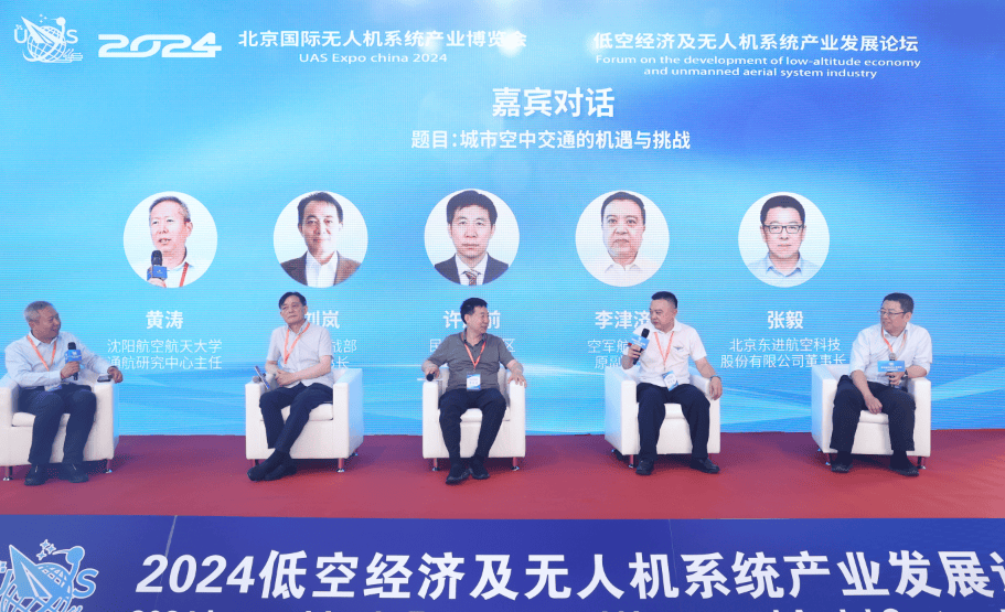 圖為嘉賓對話:沈陽航空航天大學通航研究中心主任黃濤、空軍作戰(zhàn)部原副部長劉嵐、民航華北地區(qū)空管局原書記許超前、空軍航管局原副局長李津濟、北京東進航空科技股份有限公司董事長張毅出席論壇